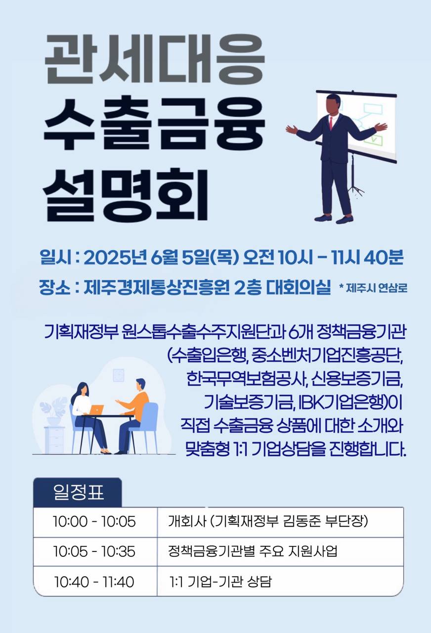 [마감][기획재정부 원스톱 수출수주지원단] 관세대응 수출금융 설명회 개최 안내(6.5목, 제주)