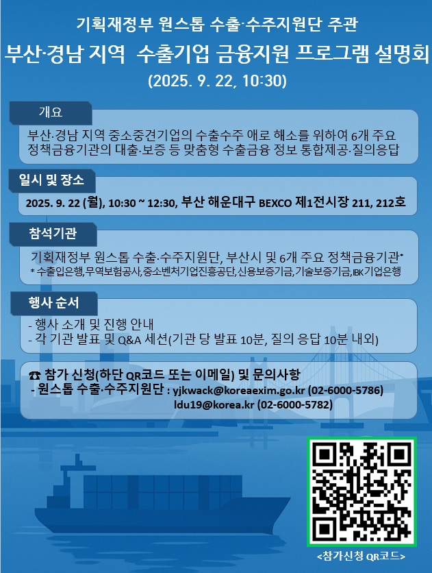 [마감][기획재정부 원스톱 수출수주지원단] 정책금융기관 합동 수출금융설명회 개최 안내(부산경남지역)(9.22월)