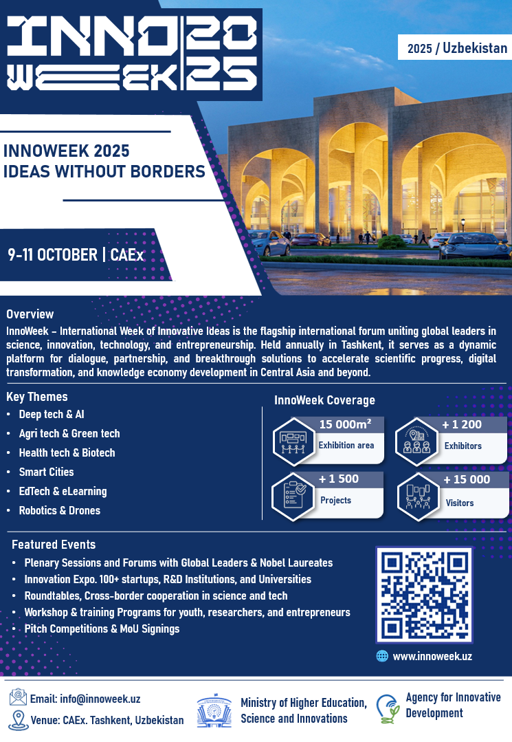 우즈베키스탄 혁신청 주관으로 2025 INNOWEEK 행사가 아래와 같이 개최되오니, 스마트시티 분야 한국 기업의 적극적인 참여를 부탁드립니다.