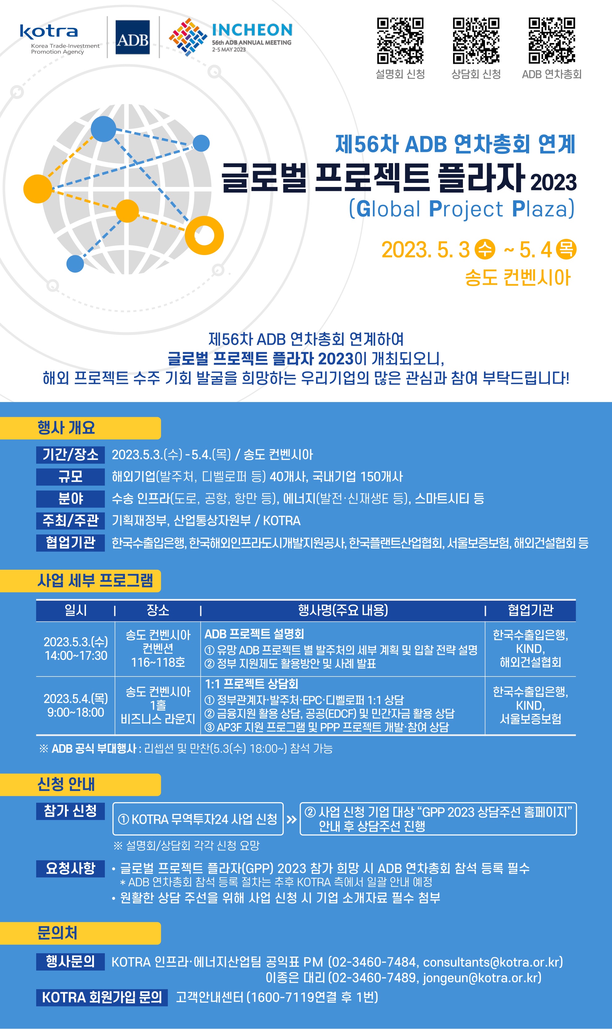 제56차 ADB 연차총회 연계하여 글로벌 프로젝트 플라자 2023이 개최되오니, 해외 프로젝트 수주 기회 발굴을 희망하는 우리기업의 많은 관심과 참여 부탁드립니다.