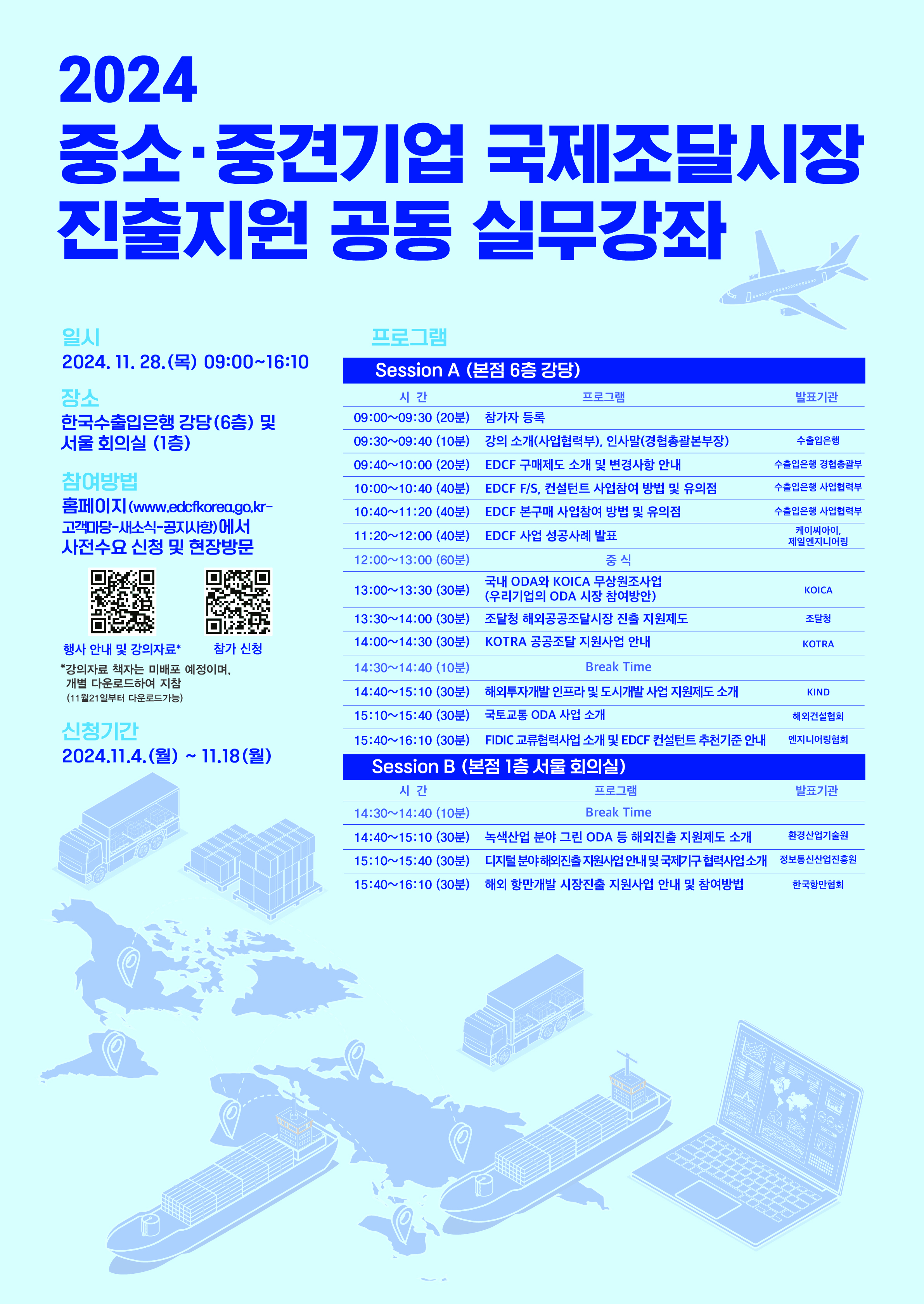 한국수출입은행에서 주관하는 「2024년 중소·중견기업 국제조달시장 진출지원 실무강좌」 개최를 하기와 같이 안내드립니다.