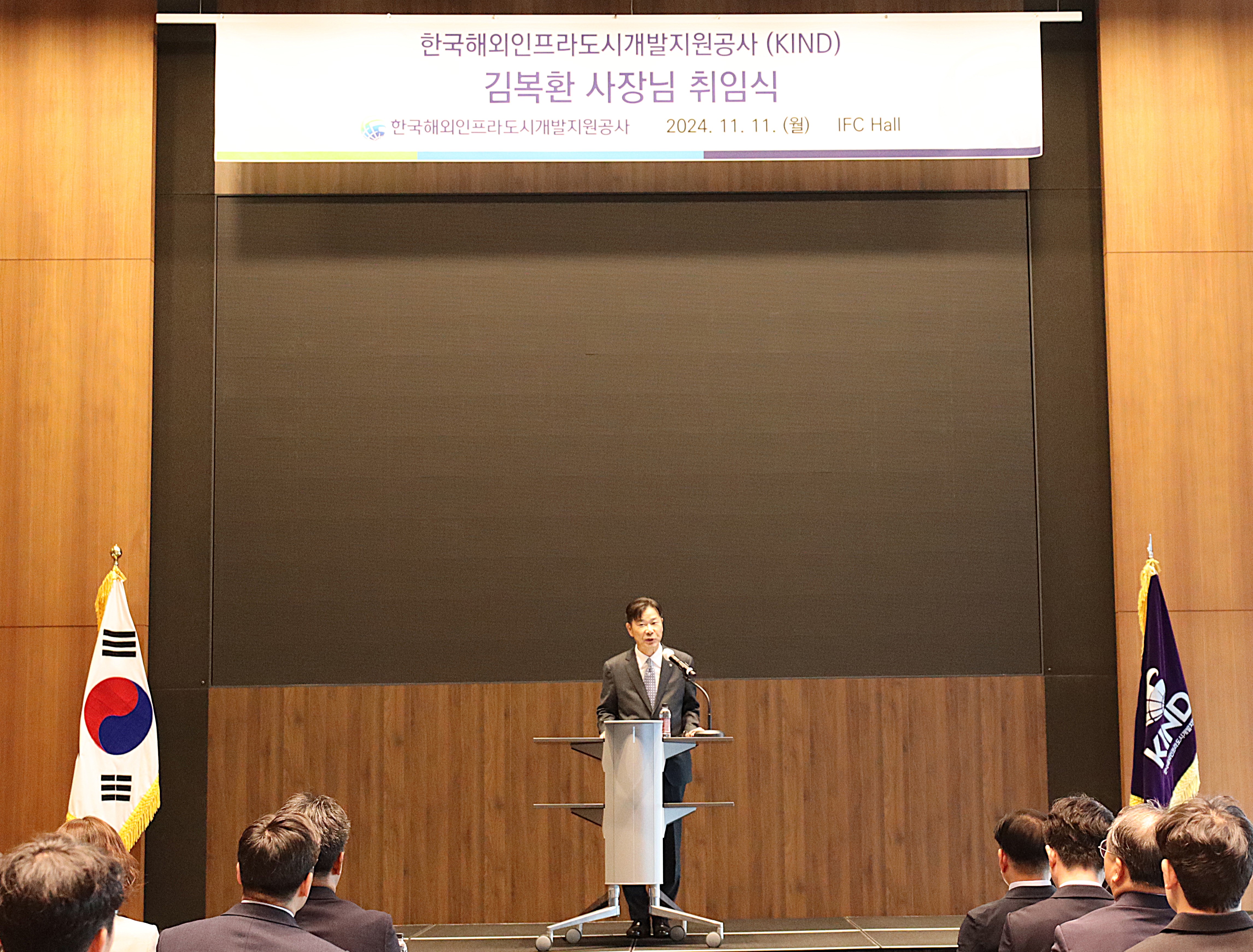 한국해외인프라도시개발지원공사(이하 KIND, 사장 김복환) 김복환3 신임 사장이 11공식 취임했다. 김복환 신임 사장은 이날 오후 열린 취임식을 통해 직원들과 첫 만남을 가졌다.