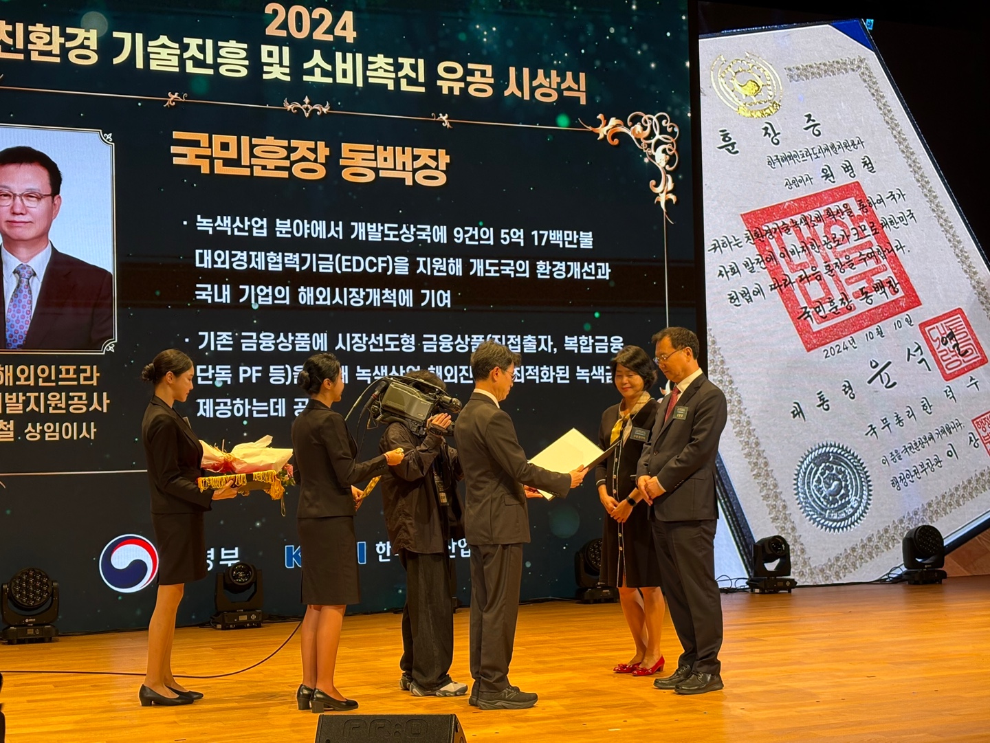 10일 서울 강남구 코엑스에서 열린 「2024 친환경 기술진흥 및 소비촉진 유공」시상식에서 한국해외인프라도시개발지원공사(이하 KIND)의 원병철 사업개발본부장이 국민훈장 동백상을 수상했다.