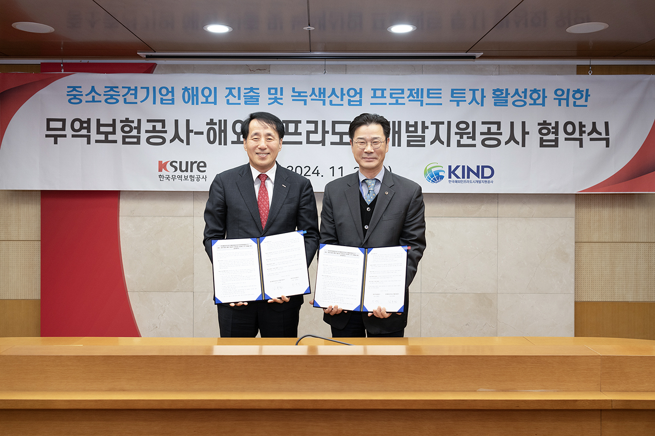 한국해외인프라도시개발지원공사(이하 KIND)와 한국무역보험공사(이하 K-SURE)는 27일 K-SURE 본사에서 중소·중견기업의 해외 진출 및 녹색산업 프로젝트 수주 지원을 위한 업무협약을 체결했다.